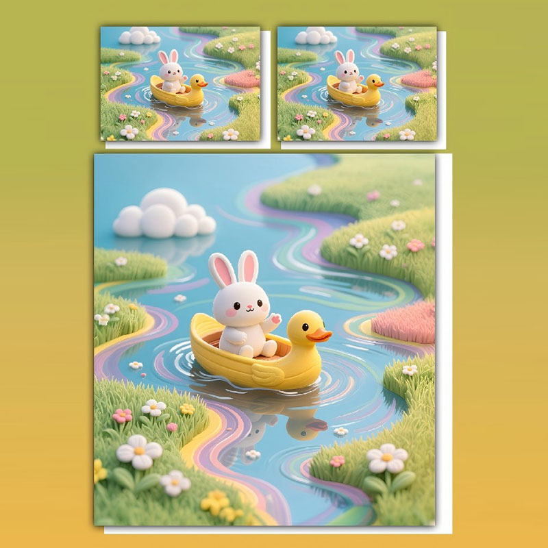 This set features our exclusive, hand-drawn cartoon illustration of a cute white rabbit and a cheerful yellow duck in a bright yellow boat, set against a dreamy river landscape. With its playful charm and unique storytelling, this design is sure to delight kids and adults alike, adding a touch of whimsy to your home.