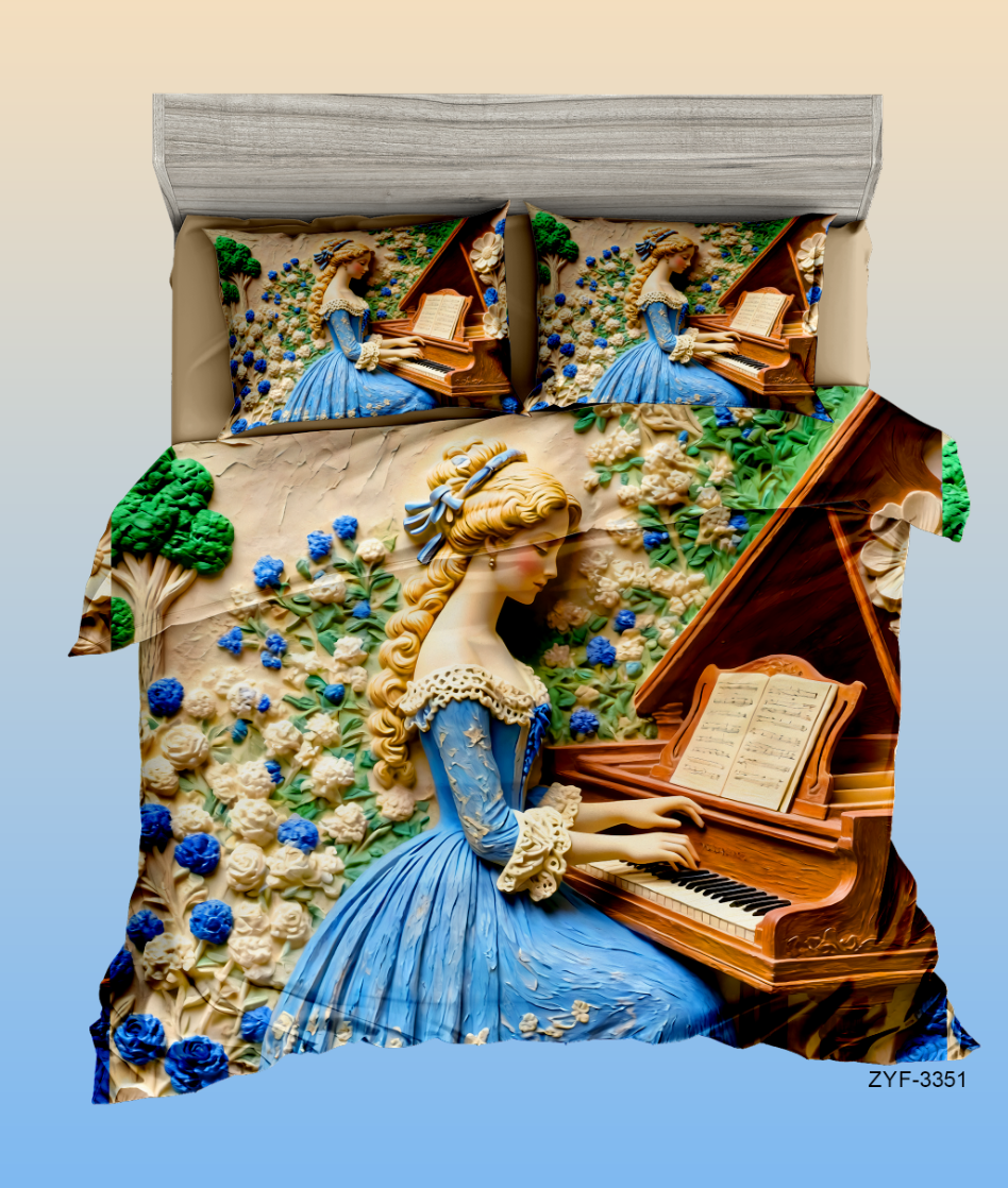 This exquisite bed sheet set features a captivating 3D-like design of a princess gracefully playing a grand piano amidst an enchanted garden. The main visual elements include the elegantly dressed princess in a blue gown, the intricately detailed piano, and a lush garden filled with white and blue roses, and verdant trees. The rich color palette, dominated by soft blues, creams, and greens, creates a serene and dreamy atmosphere. This design is appealing to those who appreciate classical beauty, fairy-tale aesthetics, and a touch of fantasy, making it suitable for children's rooms or anyone desiring a romantic and artistic bedroom ambiance.