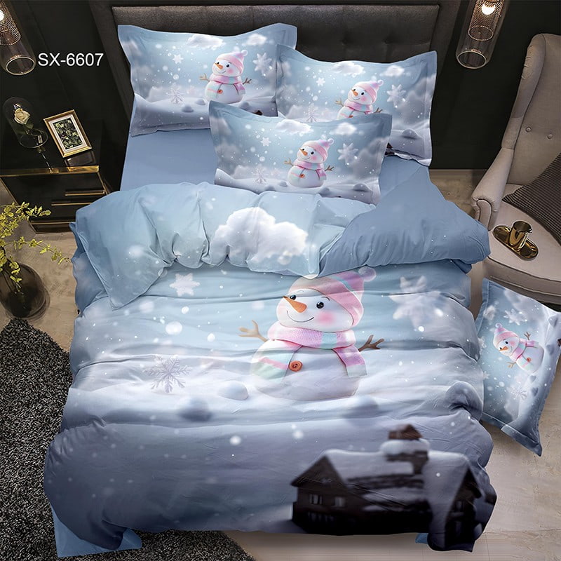 This bed sheet set showcases a delightful winter scene featuring a charming snowman adorned with a pastel pink and blue scarf and a matching hat. Set against a soft blue snowy background, the design captures the magic of a serene snow-covered landscape with delicate snowflakes gently falling from the sky. The overall atmosphere is cozy and whimsical, evoking feelings of warmth and joy during the winter season. The inclusion of a distant snow-covered cabin adds depth and a touch of rustic charm to the design.