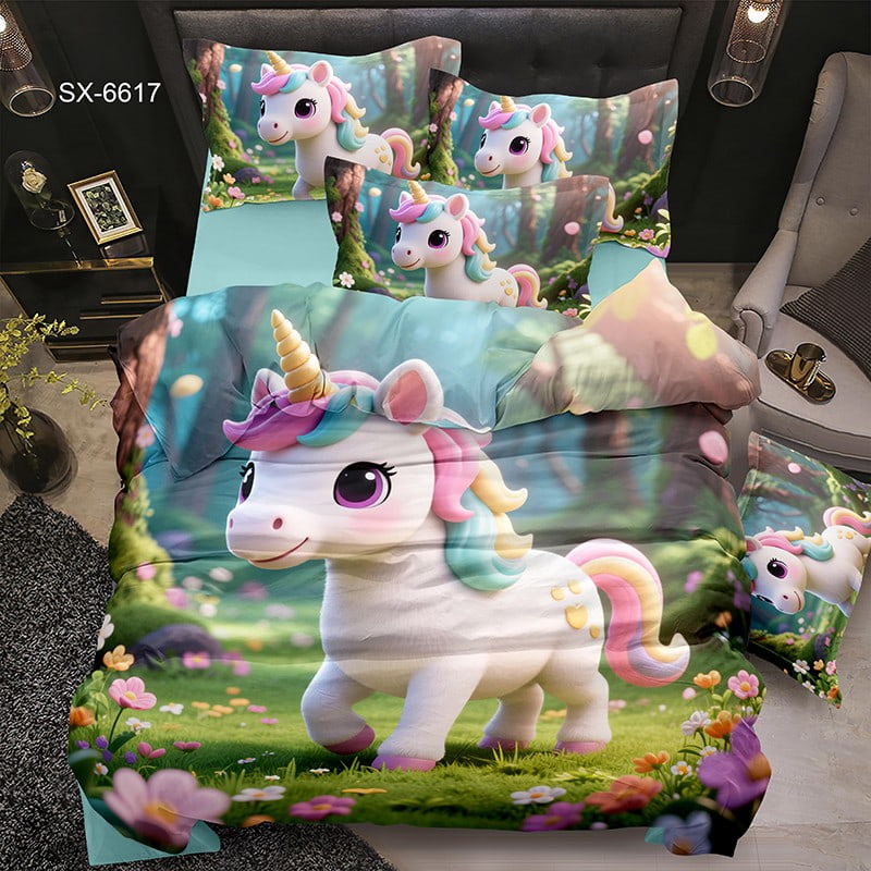 This bed sheet set features an enchanting 3D digital print of a charming cartoon unicorn with large expressive eyes, pastel-colored mane, and a golden horn, set against a whimsical forest backdrop. The vibrant scene includes lush green grass, colorful flowers, and softly blurred trees, creating a dreamy and playful atmosphere perfect for children's bedrooms or anyone who loves fantasy themes. The overall color palette blends soft blues, pinks, greens, and purples, evoking a sense of wonder and joy.