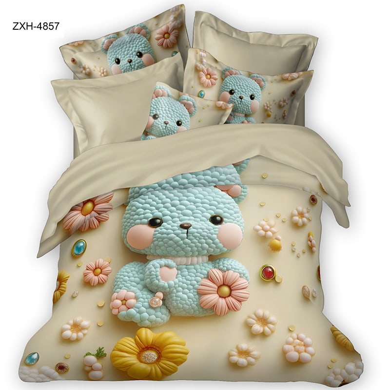 This bed sheet set features an adorable and charming design centered around a 3D textured blue teddy bear with a soft, pebble-like surface. The bear is surrounded by a variety of delicately rendered flowers in pastel shades of peach, cream, and yellow, alongside small jewel-like embellishments in blue and red tones. The background is a warm beige, creating a cozy and inviting atmosphere. The artistic style is whimsical and playful with a three-dimensional effect that adds depth and visual interest to the overall design.