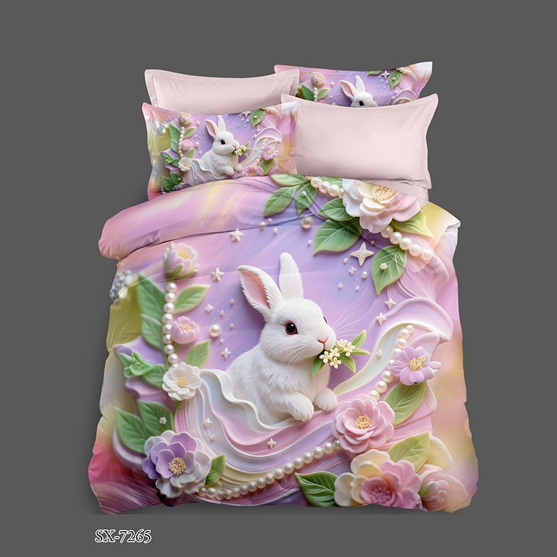 This bed sheet set showcases a charming white bunny nestled amidst an enchanting garden of pastel-colored flowers and green leaves. The design features delicate pearls and star-shaped accents, creating a whimsical and elegant atmosphere. Soft gradients of pink, purple, and yellow blend harmoniously in the background, enhancing the dreamy and serene mood of the scene. The overall style is both playful and sophisticated, making it perfect for adding a touch of fantasy and warmth to any bedroom.