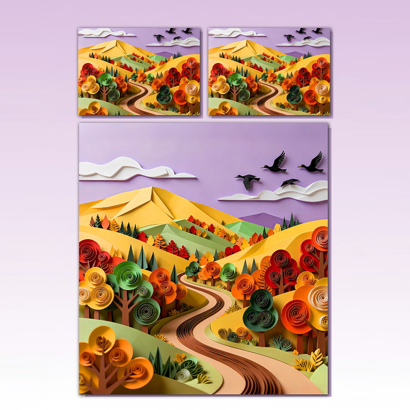 Original Design: The exclusive design captures the essence of a picturesque autumn pathway, enveloped by colorful rolling hills and majestic birds in flight. It's a masterpiece that invites tranquility and warmth into your space.
