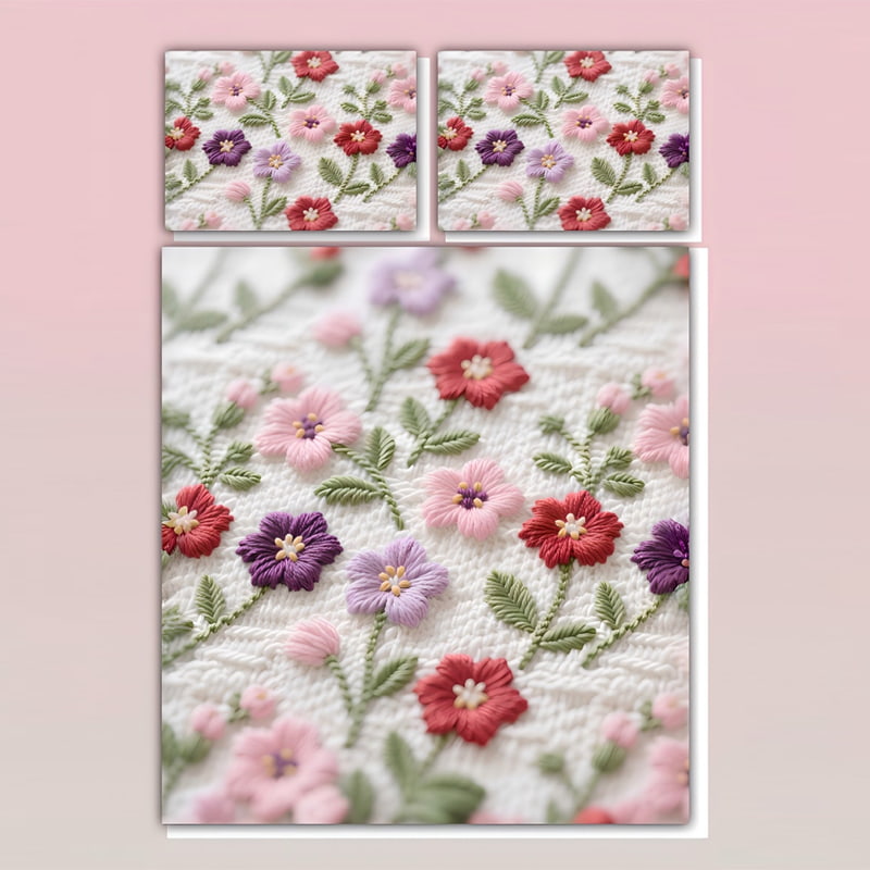 Bring a touch of spring into your bedroom with Blossom Meadow, featuring stunning 5D digital printing that recreates the look and feel of hand-stitched embroidery. The delicate red, purple, and pink flowers bloom gracefully across a textured white background, creating a captivating 3D illusion of depth and texture.