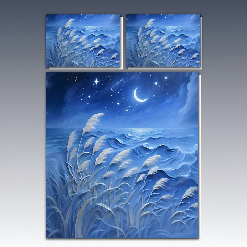 Crafted with 5D Digital Printing Technology, this bedding set captures every intricate detail of the serene coastal scene. The design features blue reeds swaying gently by the water, a moonlit sky dotted with twinkling stars, and calm ocean waves that create a soothing atmosphere. Each element—reeds, moon, stars, and waves—is printed with pixel-level accuracy, ensuring vibrant colors and intricate details remain flawless even after repeated washes. This technology eliminates the need for pre-made screens or plates, enabling us to deliver customized designs that perfectly match your personal style.
