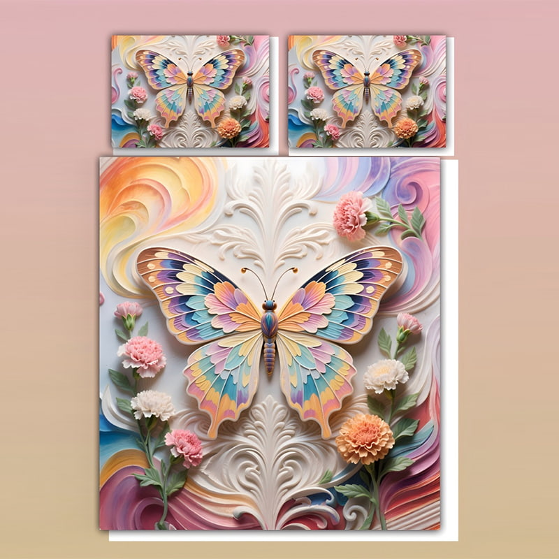 Our bedding set is a masterpiece of digital artistry. The butterfly is rendered with vibrant rainbow wings (shades of pink, blue, yellow, and purple blend seamlessly), and its 3D texture makes it feel like you could touch its delicate wings. Surrounding the butterfly are lifelike flowers—soft pink carnations, pristine white blooms, and warm orange blossoms—all with lifelike petals and stems. Even the scroll-like floral patterns in the background have a 3D embossed look, adding depth and elegance. Every element is designed to feel tactile, as if you’re holding a work of art.