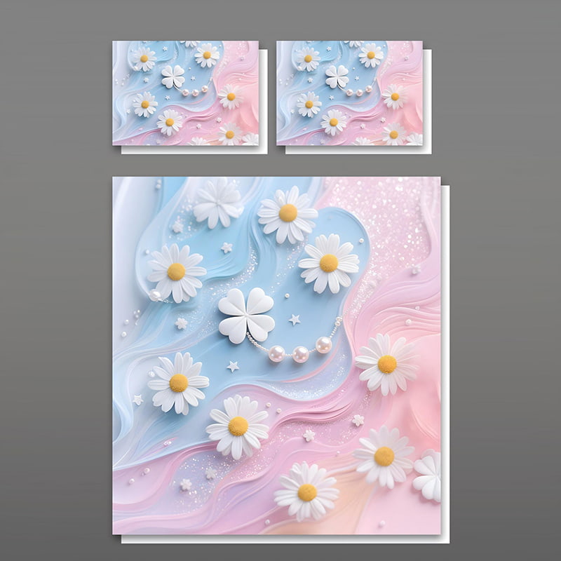 The design showcases a charming arrangement of white daisies with bright yellow centers, surrounded by a gentle swirl of pearls and sparkling stars. The combination of floral beauty with the elegance of pearls and the delicate star accents creates a harmonious and dreamlike scene. The soft blue and pink waves flowing through the design add a sense of fluidity, making it both enchanting and sophisticated.