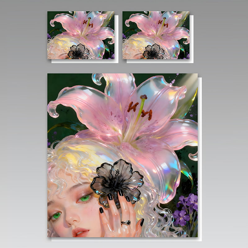 The design blends the softness of pastel pink lilies with the ethereal charm of a graceful muse. Every petal glows with a translucent, pearl-like sheen while the delicate portrait adds a touch of fantasy and modern art—perfect for those who love elegance with personality.