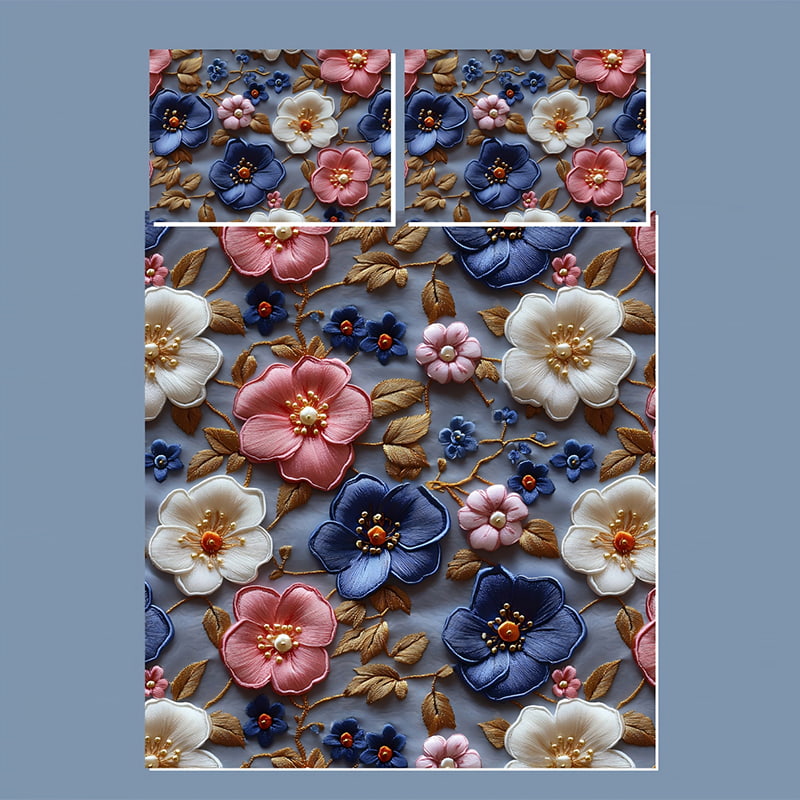 Immerse yourself in the elegance of the Blue & Pink Floral Bedding Set, designed with cutting-edge 5D digital printing technology. The vivid hues of navy blue, blush pink, and ivory flowers bloom gracefully against a soft gray background, delivering exceptional color accuracy and breathtaking visual impact.