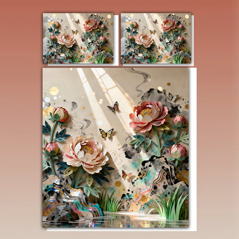 Our bedding set features 5D digital printing of a vibrant floral scene. This advanced printing method captures every detail of the blossoms—petal gradients, butterfly wings, and even the delicate brushstroke-like background—ensuring a lifelike display that brings a burst of color and nature’s beauty to your bedroom.