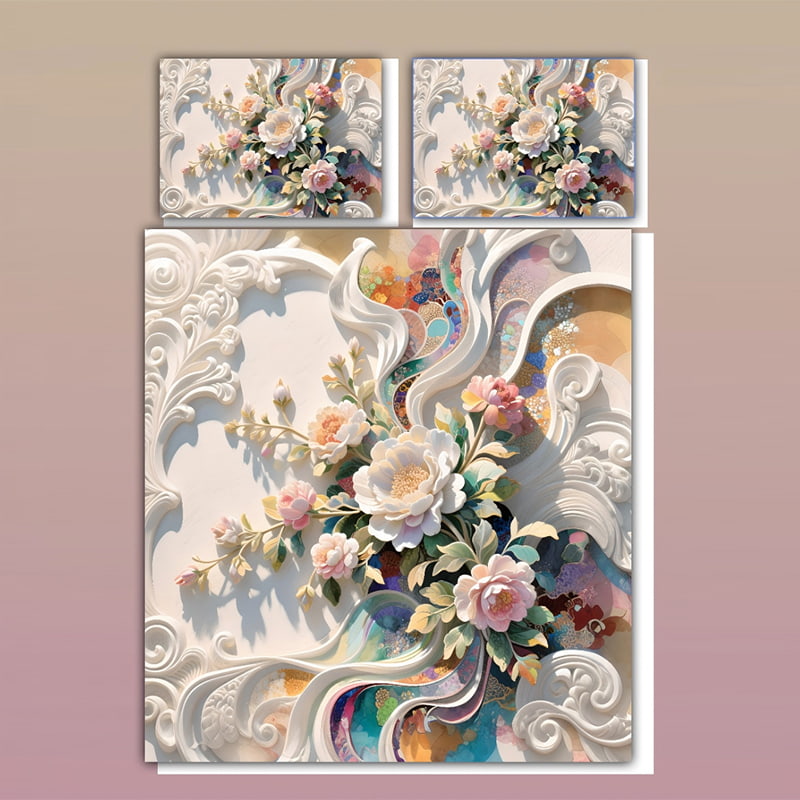 This 5D Digital Print Bedding Set features an exquisite design of elegant peonies and soft blossoms, intricately layered against a backdrop of vibrant, colorful patterns. The 5D printing technique brings a breathtaking three-dimensional effect to each flower, leaf, and delicate swirl, giving the design depth and realism. The interplay of soft pastels and rich colors creates an eye-catching, luxurious look that will transform your bedroom.