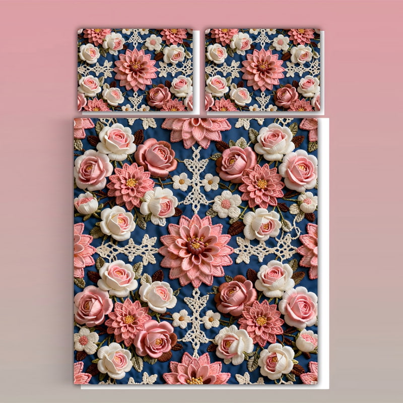 This bedding set features a stunning floral design with a harmonious blend of lotus flowers, roses, and delicate crochet lace accents. Using advanced 5D digital print technology, the design boasts a rich, lifelike texture that adds depth and dimension, making the flowers and lace appear to "pop" off the fabric. The result is a visually captivating effect that transforms your bedroom into a floral haven.