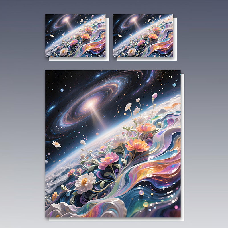 This exclusive design blends art and imagination — delicate flowers blossom amidst swirling galaxies and cosmic waves of color. The ethereal palette of purples, blues, golds, and pinks evokes a sense of mystery, serenity, and endless beauty inspired by the universe.