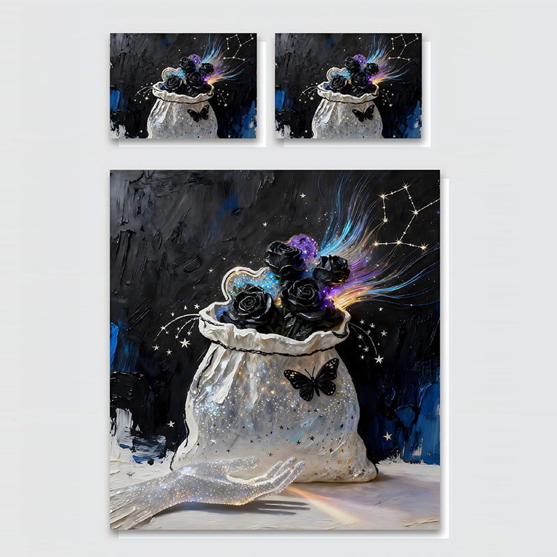Immerse yourself in cosmic elegance with the Galaxy Bloom bedding set, showcasing a mesmerizing bouquet of black roses glowing from within a celestial silk pouch. Bursts of radiant colors — violet, blue, and gold — flow like stardust into the night sky, while constellations and butterflies add an enchanting touch of fantasy and mystery.