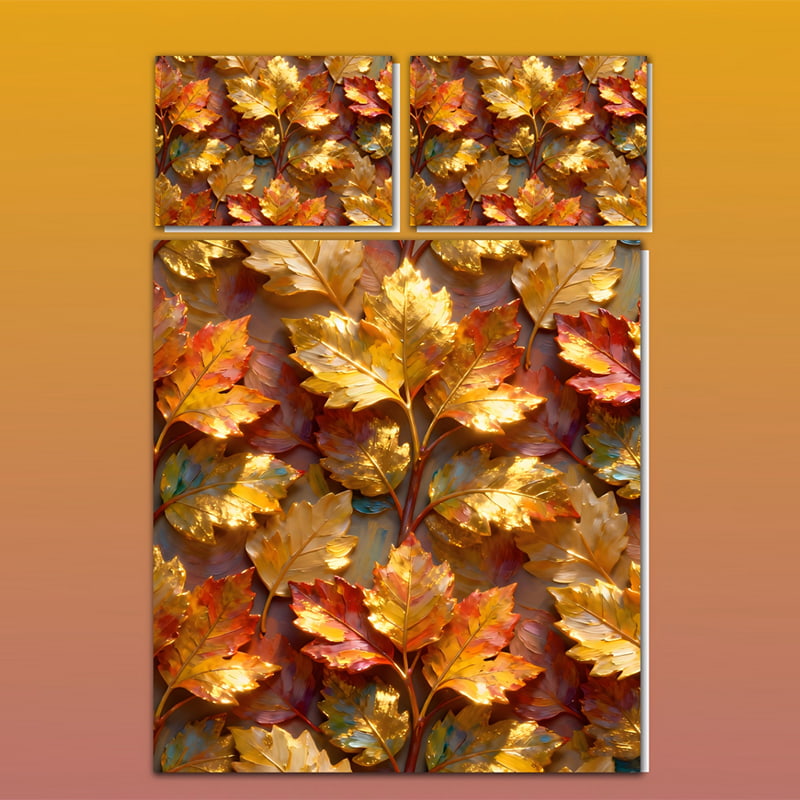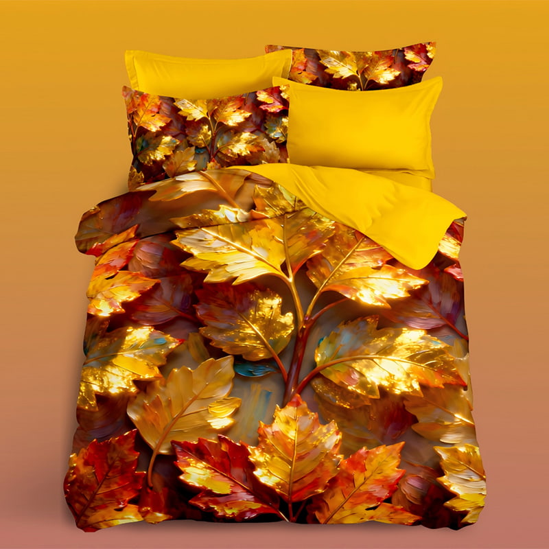 Embrace the beauty of autumn with the “Golden Autumn Leaves” bedding set, showcasing advanced 5D digital printing technology. The vivid layers of golden, amber, and crimson leaves create a breathtaking 3D visual effect that feels both warm and luxurious. Each leaf shimmers with realistic metallic highlights, turning your bedroom into a radiant autumn landscape.