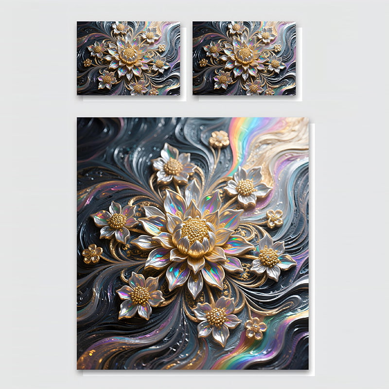 This exclusive design captures the essence of luxury and movement. The central golden blossom radiates against flowing pearl-like textures, accented by rainbow reflections and fine metallic detailing — symbolizing beauty, vitality, and grace. It transforms your bedroom into a luminous gallery of modern art.