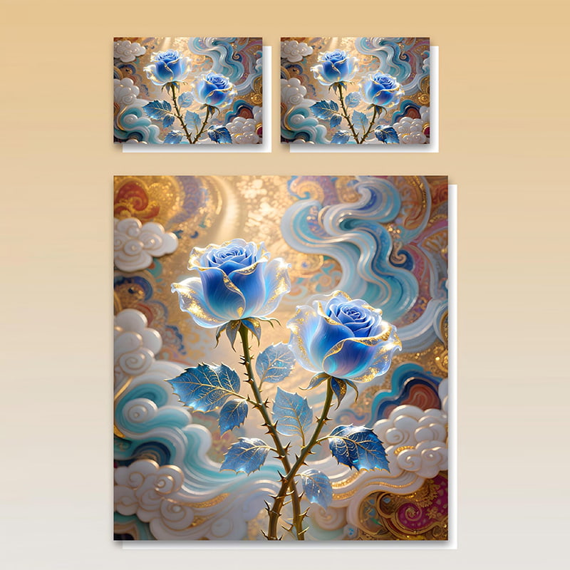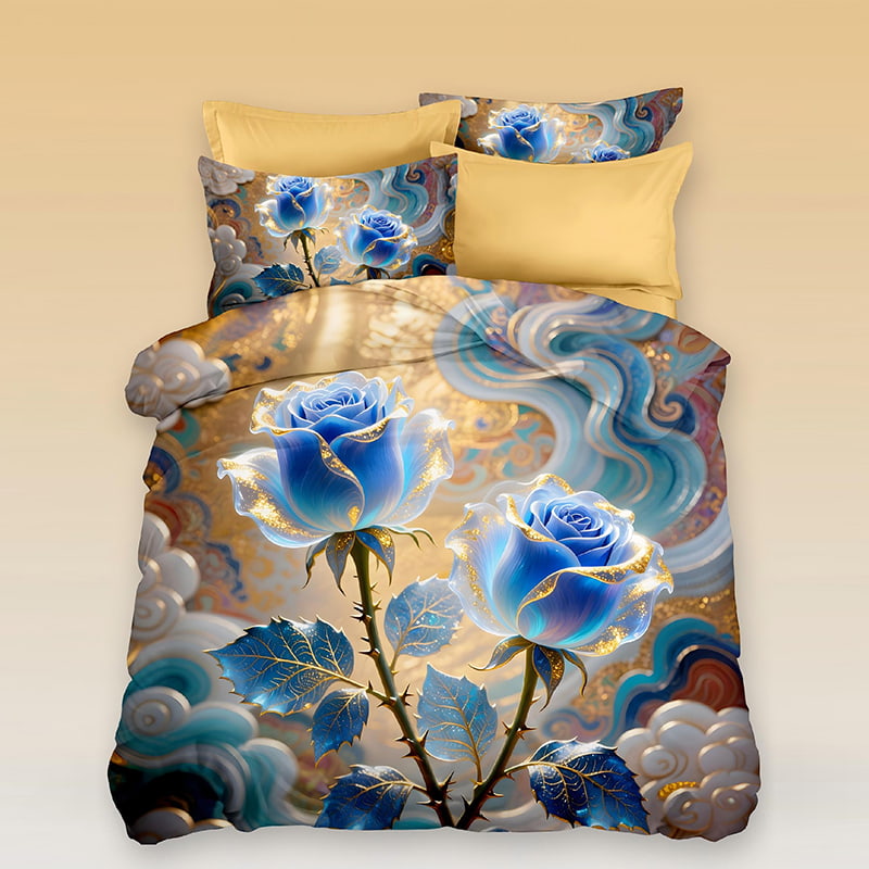 With its majestic combination of royal blue, shimmering gold, and creamy tones, this bedding set brings a sense of opulence and calm to any room decor. Ideal for those who appreciate art-inspired designs and refined living, the Golden Blue Rose Elegance set is both timeless and enchanting.