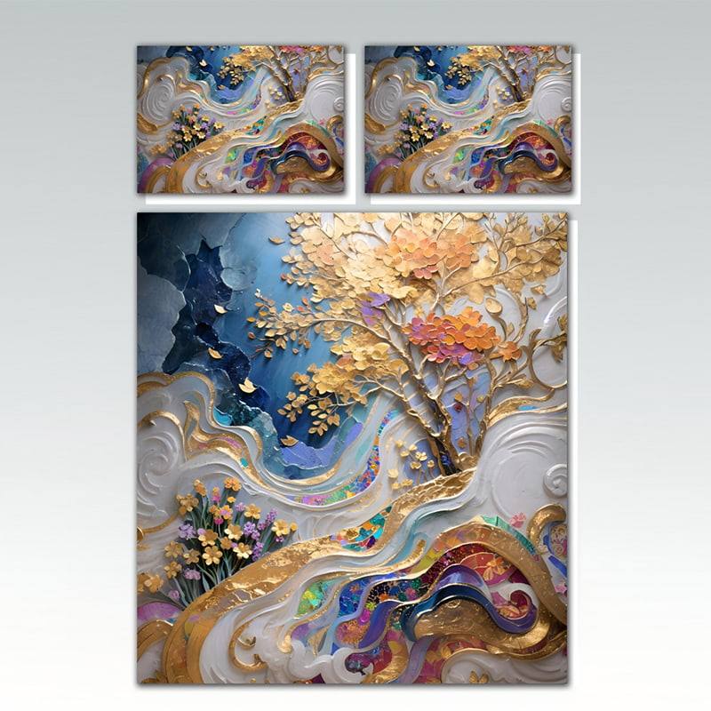 Crafted with 5D Digital Printing Technology, this bedding set captures every intricate detail of the artistic floral arrangement. The design features a golden forest with trees adorned in warm gold leaves, vibrant colorful flowers (including orange blooms and purple blossoms), and swirling cloud-like patterns in soft pastel hues. Each element—leaves, petals, and cloud swirls—is printed with pixel-level accuracy, ensuring vibrant colors and intricate details remain flawless even after repeated washes. This technology eliminates the need for pre-made screens or plates, enabling us to deliver customized designs that perfectly match your personal style.