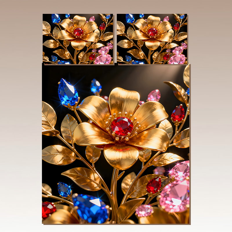 The 5D print technique brings every petal and gem to life with astonishing realism. From the luster of the gold leaves to the multi-faceted shine of the gemstones, the layered effect adds a tactile richness and depth that feels almost touchable — turning your bedding into a work of art.