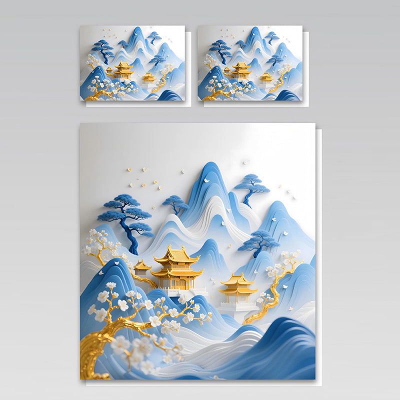 Elevate your bedroom with the mesmerizing Golden Palace in Blue Mountains bedding set. Using advanced 5D digital printing, the design showcases vivid depth and lifelike detail — from the flowing blue mountains to the radiant golden palace and blooming branches. Every layer appears three-dimensional, creating an immersive, artistic atmosphere.