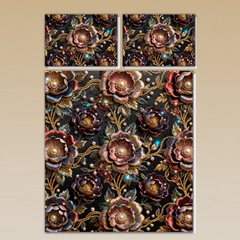 Immerse your bedroom in luxury with the “Golden Pearl Rose” 5D Digital Print Bedding Set. Featuring grand metallic roses with glowing pearl centers, this design combines shimmering gold vines, deep burgundy petals, and radiant highlights that create an exquisite 3D visual effect. The 5D digital printing technology brings every flower to life with stunning realism and depth.