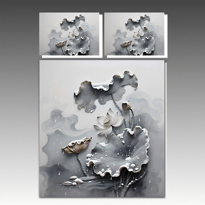 Crafted with 5D Digital Printing Technology, this bedding set captures every intricate detail of the Chinese-inspired lotus scene. The design features grey lotus leaves with delicate textures, white lotus flowers with soft petals, raindrops falling from the leaves, and seed pods adding a natural touch. Each element—leaves, flowers, raindrops, and seed pods—is printed with pixel-level accuracy, ensuring vibrant colors and intricate details remain flawless even after repeated washes. This technology eliminates the need for pre-made screens or plates, enabling us to deliver customized designs that perfectly match your personal style.