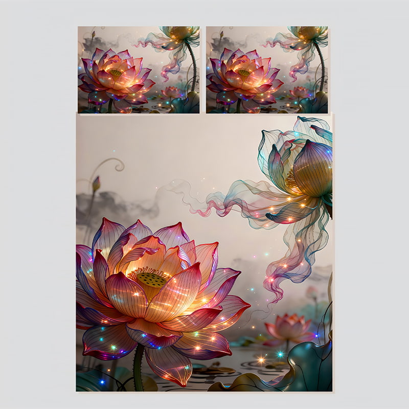 Inspired by the elegance of illuminated lotus flowers floating gently on misty waters, this exclusive design captures harmony, peace, and natural grace. The glowing lotus motifs and delicate transparent petals symbolize purity and renewal — making this bedding set a perfect centerpiece for your modern or artistic home décor.