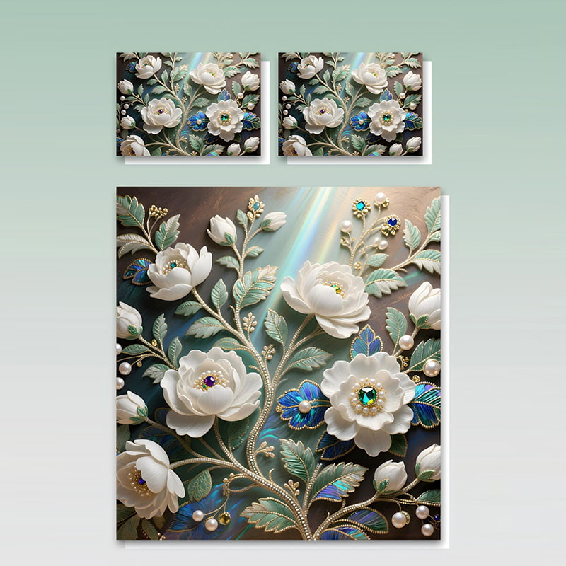 Our digital printing technology ensures every petal, leaf, and jewel is rendered with stunning precision. The intricate floral motifs, accented by shimmering gemstones and delicate pearl details, create a luxurious, handcrafted look that’s impossible to achieve with traditional printing methods.
