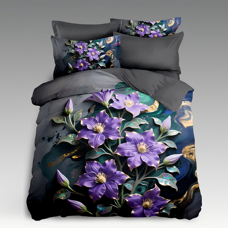 Our bedding set is crafted using 5D Digital Printing Technology, a cutting-edge method that revolutionizes textile decoration. The design features vibrant purple clematis flowers with delicate petals, gold-embellished leaves and stems, and swirling abstract patterns in deep blue and gold hues. Each element—petals, gold accents, and abstract swirls—is printed with pixel-level accuracy, ensuring vibrant colors and intricate details remain flawless even after repeated washes. This technology eliminates the need for pre-made screens or plates, enabling us to deliver customized designs that perfectly match your personal style.