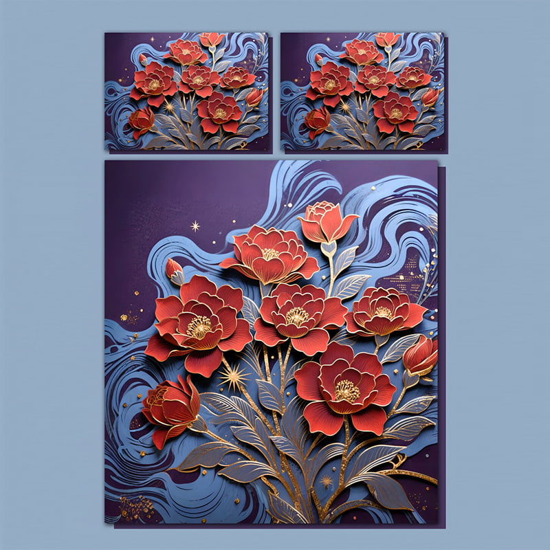 Our bedding set is crafted with 5D digital printing technology, bringing the intricate beauty of the “Red & Gold Peony” theme to life. Every detail—vivid red peony blossoms, golden accents, swirling patterns, and sparkling stars—is rendered with precision, ensuring vibrant colors and sharp patterns that stay vivid wash after wash.