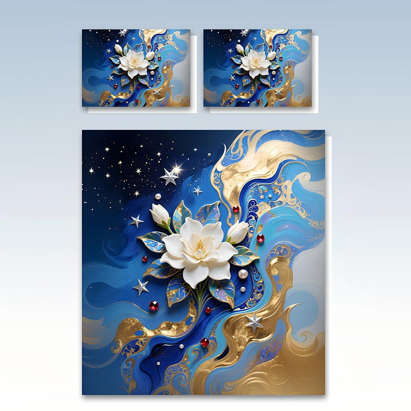 This bedding set features an exquisite 5D digital print of a magnificent white magnolia flower, adorned with sparkling pearls, rubies, and gold accents. The advanced 5D printing technique gives the design a stunning, lifelike effect, with the flower and decorative elements appearing as if they are raised from the fabric. The vibrant blue, gold, and pearl elements create a dynamic and luxurious visual experience, perfect for a sophisticated bedroom ambiance.