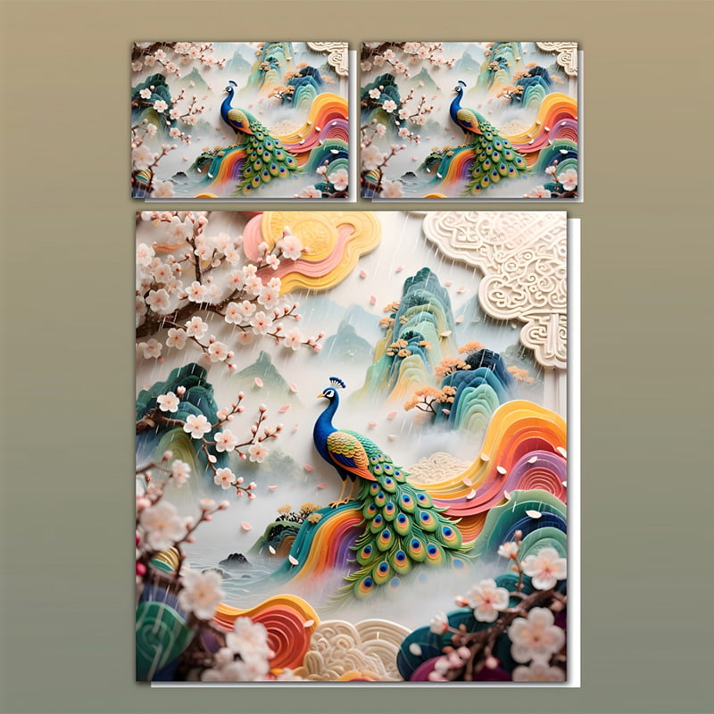 The peacock’s iridescent feathers shimmer with multi-layered color and dimension, creating a mesmerizing 5D visual effect that feels almost sculptural. Combined with the delicate pink sakura flowers and soft, ethereal mountains, the print delivers a breathtaking sense of realism and motion, transforming your bed into a piece of art.