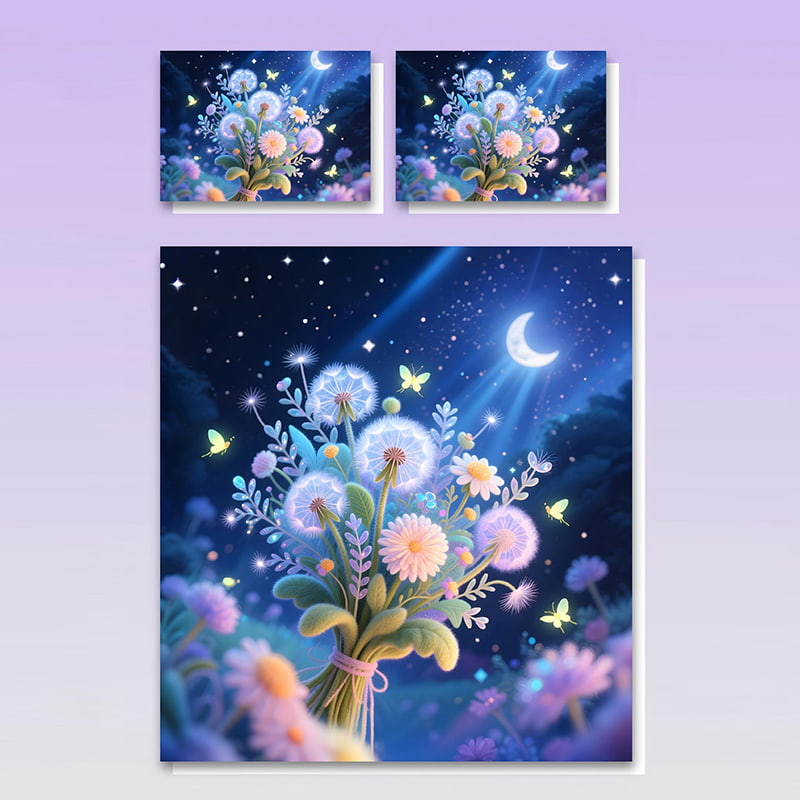 Immerse yourself in the enchanting beauty of our Moonlit Dandelion Dream bedding set, featuring a breathtaking bouquet of glowing dandelions and daisies under a starlit sky. Using advanced 5D digital printing technology, every petal, leaf, and moonbeam appears vivid and lifelike, creating a dreamy, three-dimensional visual experience.