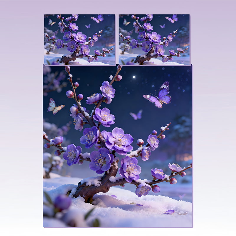 Immerse yourself in the serene beauty of the Moonlit Purple Plum Blossom 5D Digital Print Bedding Set. The design captures the elegance of violet plum blossoms blooming gracefully under a starry winter night, their petals dusted with snow and illuminated by the soft glow of the moon. Delicate butterflies flutter around the blossoms, bringing a sense of life and tranquility to your bedroom.