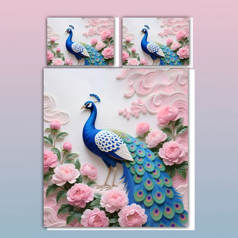 This stunning 5D Digital Print Bedding Set showcases an intricately designed peacock perched among vibrant pink peonies. The 5D printing technique enhances the depth and detail of each feather, petal, and leaf, creating a lifelike, three-dimensional effect. The beautiful mix of blue and pink hues is both bold and serene, making this set a captivating focal point for your bedroom.