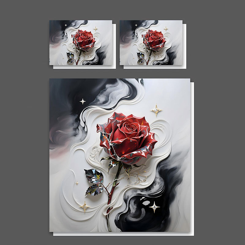 Our 5D digital print technology transforms the bedding into a work of art. The vibrant red rose, with its lifelike petals and intricate details, stands out against a dynamic backdrop of black and white swirls, creating a striking visual contrast. The addition of sparkling star motifs adds a touch of whimsy and luxury, making each piece a statement piece in your bedroom.
