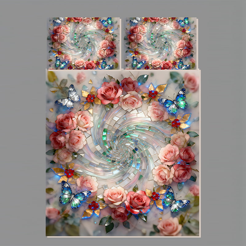Using precision 5D digital layering, this bedding set achieves a stunning dimensional effect — roses appear to bloom off the surface, while butterflies seem to flutter with a luminous shimmer. The intricate mosaic spiral adds a sense of motion and sparkle, making your bed a true centerpiece.