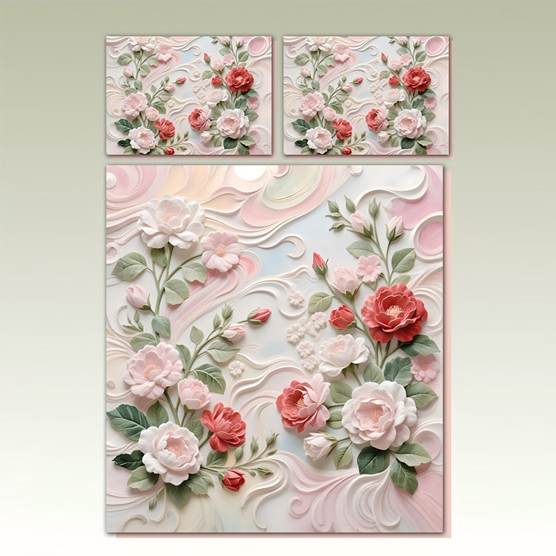 The bedding set showcases an original design, bringing together a harmonious blend of rich pinks, soft whites, and fresh greens. The delicate blossoms and roses entwine in an elegant dance, with soft, flowing curves creating a romantic and serene ambiance. This artwork is perfect for adding a luxurious touch to any bedroom, transforming your space into a peaceful retreat.
