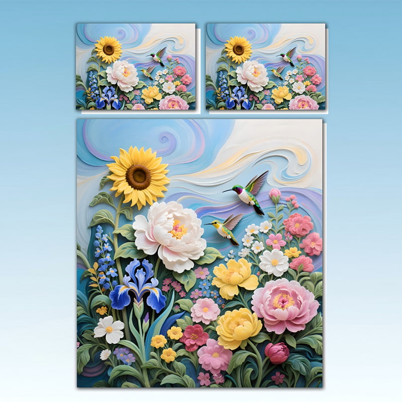 Crafted with 5D Digital Printing Technology, this bedding set captures every intricate detail of the vibrant garden scene. The design features sunflowers with bright yellow petals and dark centers, hummingbirds with iridescent green and white plumage, iris flowers in bold blue hues, and a diverse array of colorful blossoms (pink, white, yellow, and more). Each element—petals, feathers, and floral details—is printed with pixel-level accuracy, ensuring vibrant colors and intricate details remain flawless even after repeated washes. This technology eliminates the need for pre-made screens or plates, enabling us to deliver customized designs that perfectly match your personal style.