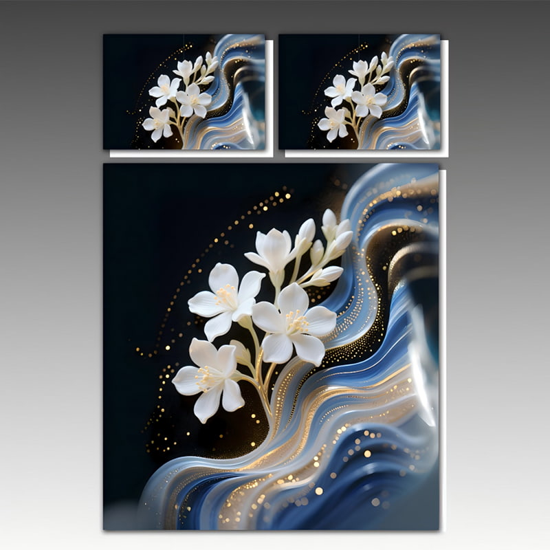 Crafted with 5D Digital Printing Technology, this bedding set captures every intricate detail of the elegant floral scene. The design features white blossoms with delicate gold stamens, blue and white swirling waves, and golden sparkles that add a touch of luxury. Each element—blossoms, waves, and sparkles—is printed with pixel-level accuracy, ensuring vibrant colors and intricate details remain flawless even after repeated washes. This technology eliminates the need for pre-made screens or plates, enabling us to deliver customized designs that perfectly match your personal style.
