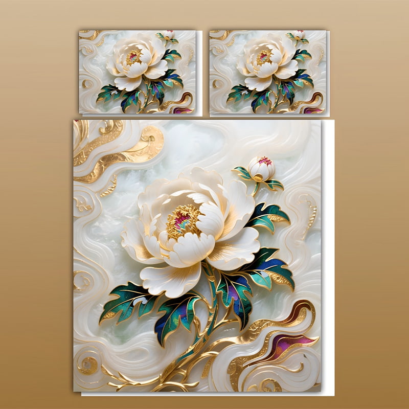 Our 5D digital print technology breathes life into the peony (the symbol of prosperity and beauty in Chinese culture) and gold scroll motifs. Every petal, leaf, and scroll is rendered with unmatched detail and depth, mimicking the texture of hand-painted art. The peony’s delicate white petals are accented with gold highlights, while vibrant green leaves and subtle purple accents add a touch of luxury. The swirling gold scrolls frame the floral design, creating a dynamic yet harmonious pattern that exudes timeless sophistication.