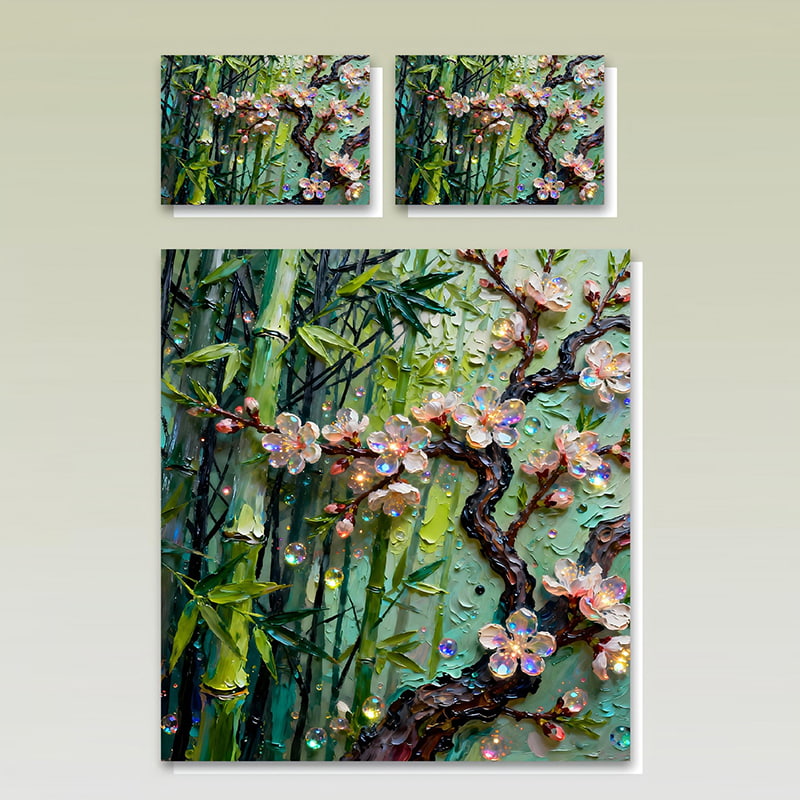 Bring artistic serenity into your bedroom with this exquisite 5D digital print bedding set. Featuring delicate peach blossoms entwined around dark branches against a lush bamboo forest, the design captures the tranquility and vitality of nature in a vivid oil painting style. Each detail—from the dewdrops on the leaves to the textured brushstroke effect—creates a lifelike, immersive visual experience.
