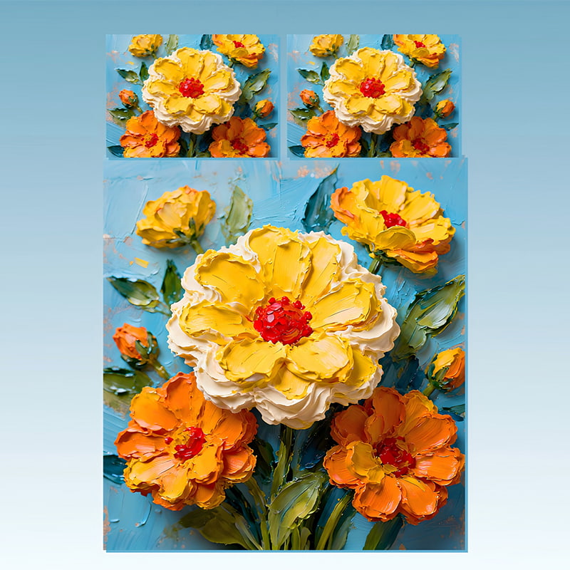 This exclusive floral composition celebrates nature’s brilliance through bold colors and expressive strokes. The golden blooms radiate warmth and energy, while the sky-blue background adds a refreshing sense of calm — a perfect balance of art and comfort.