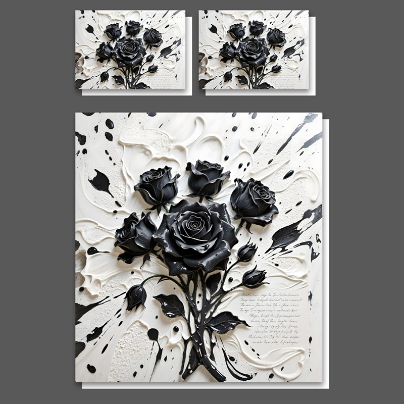The 5D digital printing technology renders black roses with brushstroke-like textures, creating a museum-quality effect. The contrasting black-and-white palette, combined with artistic splashes and handwritten calligraphy, transforms your bedroom into an elegant gallery.