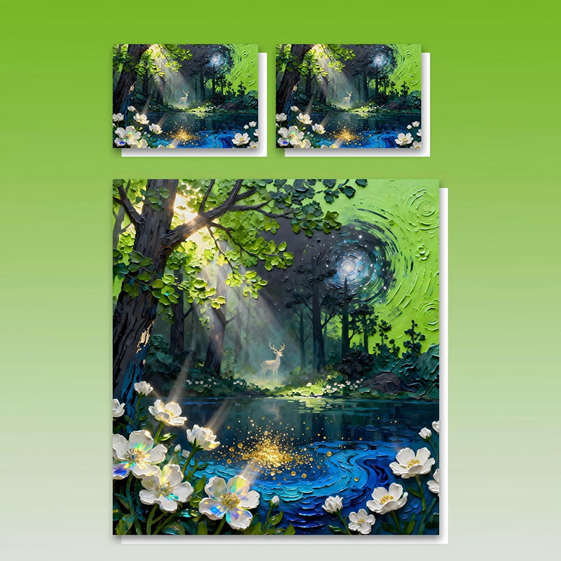1.5D Oil Painting Style: Every brushstroke and texture is meticulously replicated through digital printing, capturing the depth and vibrancy of traditional oil paintings. The forest scene, glowing moonlight, and delicate white flowers come to life on your bedding, creating a visually stunning focal point.