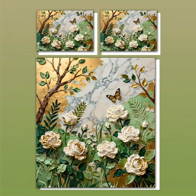 Transform your bedroom into an art gallery with this 5D oil painting–style bedding set, showcasing white roses, green foliage, golden tree branches, and delicate butterflies on a marble-textured background. The advanced digital printing technology captures every stroke and shadow with exquisite precision, creating a masterpiece of depth, texture, and brilliance.