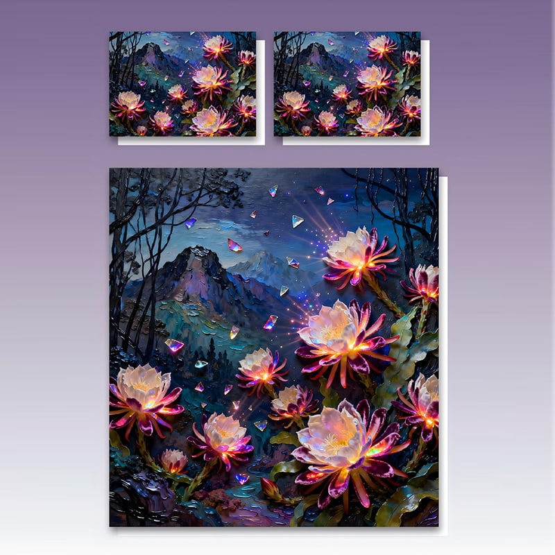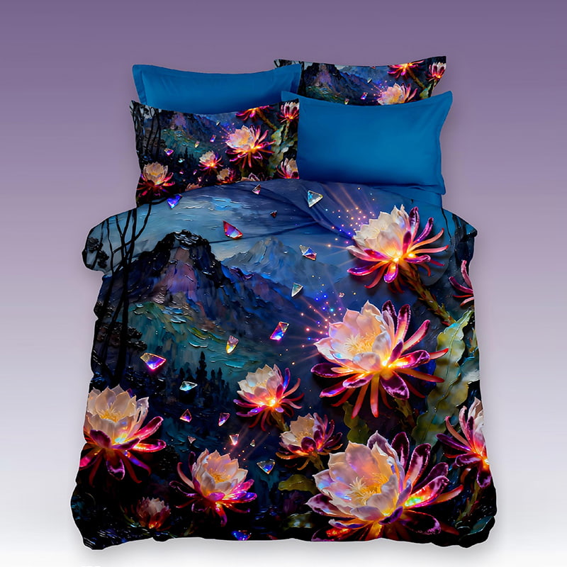 Immerse your bedroom in the magic of 5D oil painting! Our design features luminous lotus flowers with iridescent petals, set against a backdrop of crystal shards and a serene mountainous landscape. The 5D effect creates a stereoscopic, tactile texture, making the lotus blooms appear to float above the fabric—turning your bedding into a work of art that you can touch and admire.